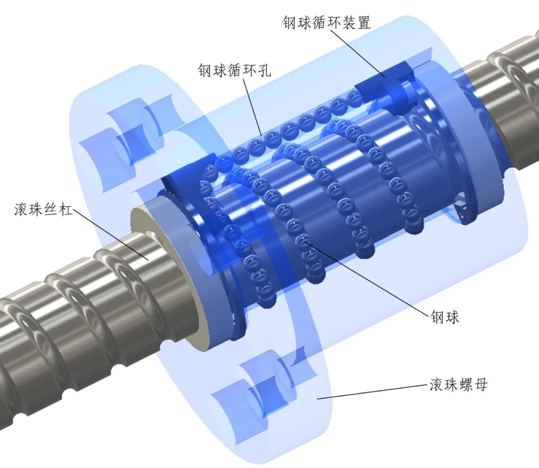 滚珠螺母两侧各设置有一个返向器,运行过程中钢球沿丝杠螺旋滚道进入一侧返向器通道内,然后经过钢球循环孔进入另一侧返向器通道,最后进入滚珠丝杠形成一个循环。