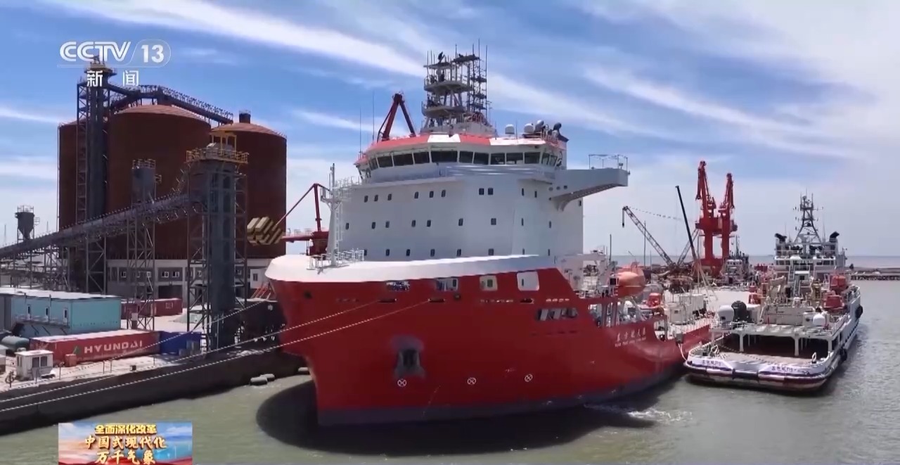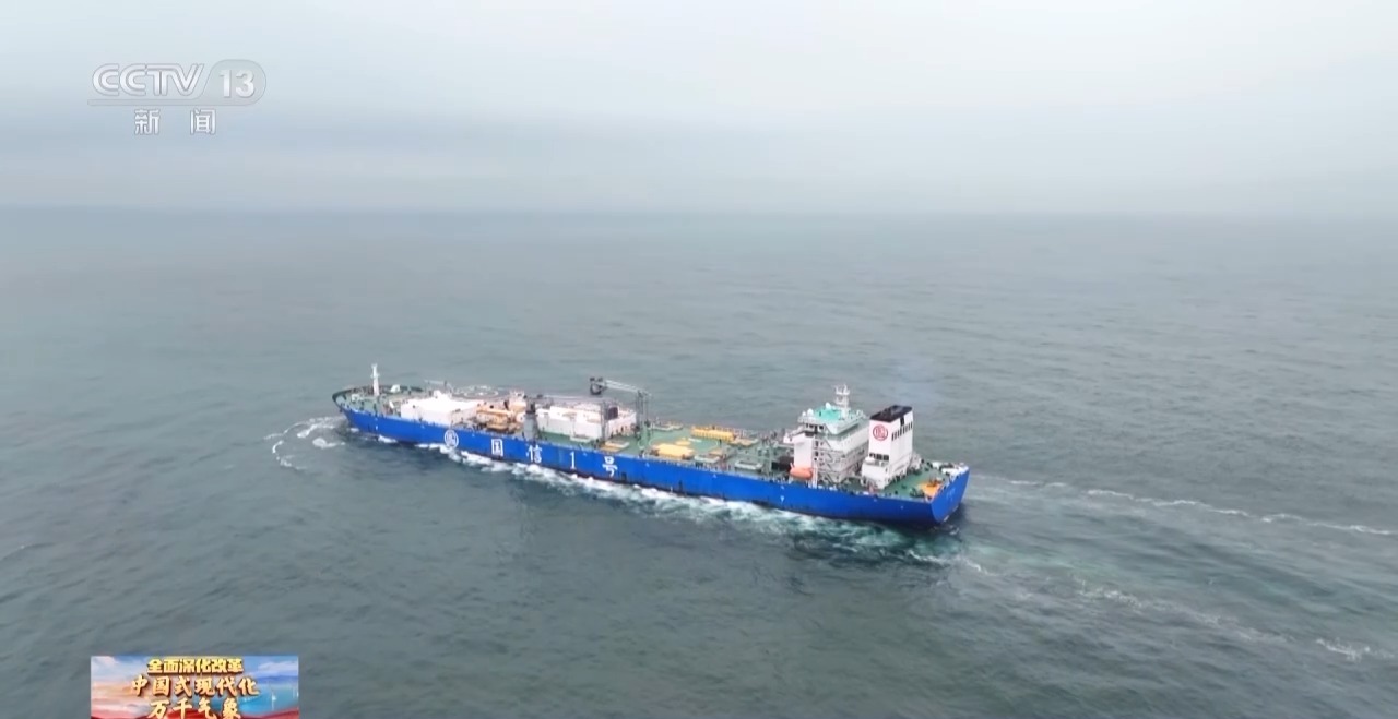 总台记者李秉禅:我现在所在的这艘船,正航行在东海北部的浙江舟山海域,距离海岸大概50海里,我们从浙江的岱山码头乘船出发,用了6个小时才到达这里。这艘船长249.9米,宽45米,光甲板面积就相当于26个篮球场的大小。从2022年开航以来,已经累计航行了12000多海里。