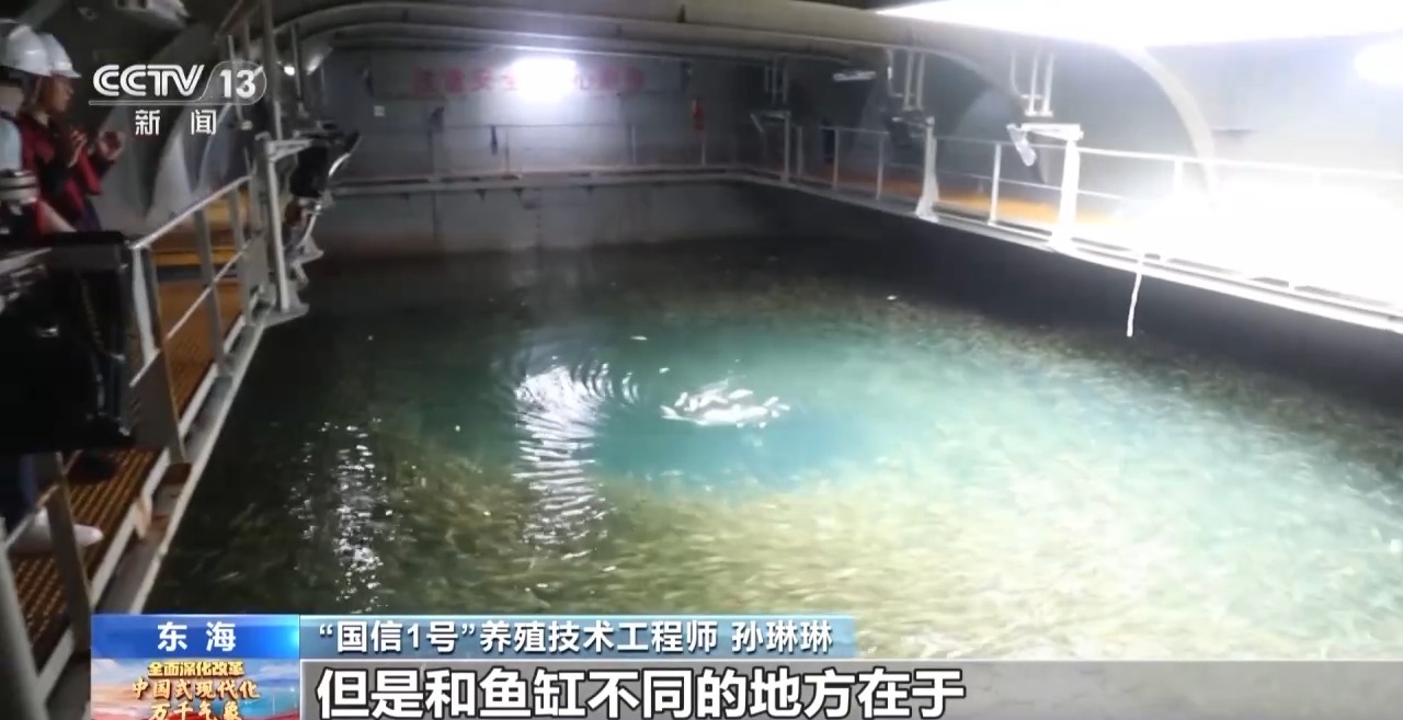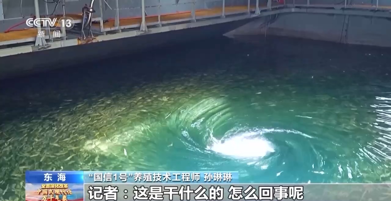 “国信1号”养殖技术工程师孙琳琳:这也是我们养鱼的一个法宝,通过进水以及排水设计,从而形成中央这种立体式的漩涡。大黄鱼的习性就是喜欢逆流游动,我们让大黄鱼一直顶流游动,生产出的大黄鱼肉质更加紧实、鲜美。