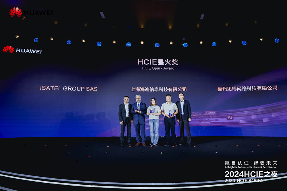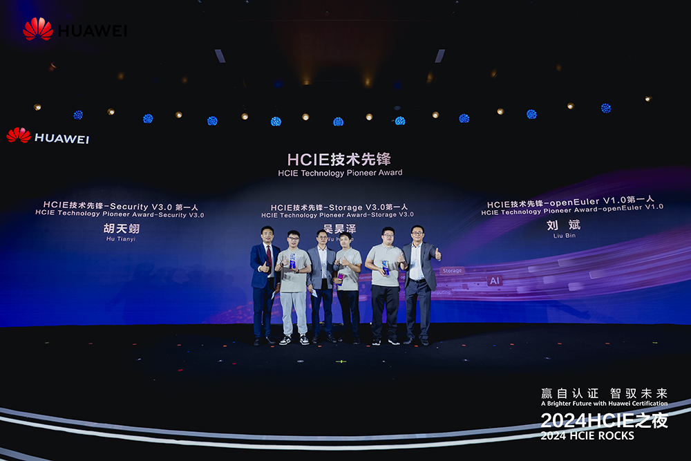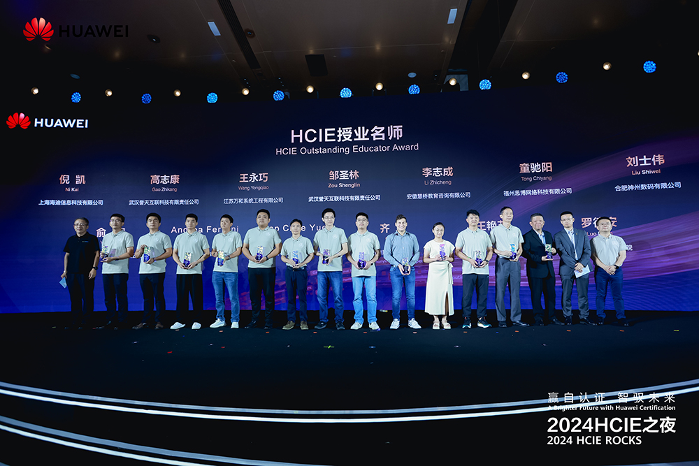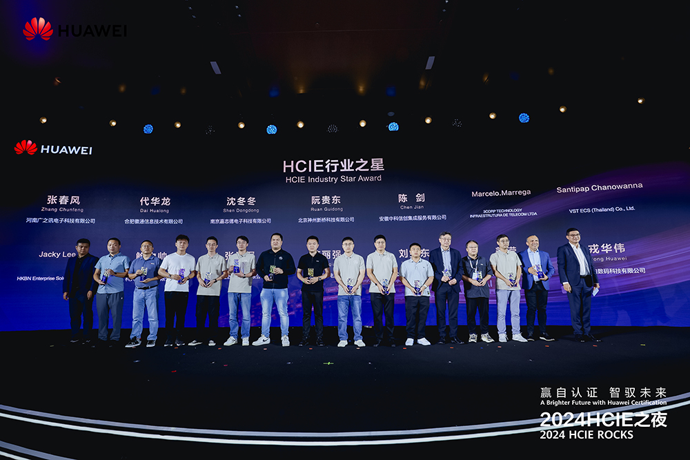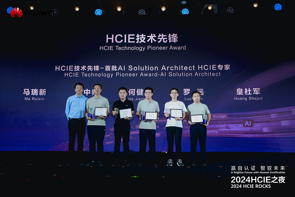 作为2024HCIE之夜的重磅环节——颁奖典礼上,华为向全球42位HCIE专家和3家伙伴分别颁发了“HCIE技术先锋奖”“HCIE行业之星奖”“HCIE星火奖”“HCIE授业名师奖”“华为产品共创奖”等五大荣誉奖项,并为首批获得HCIE-AISolutionArchitect证书的5位专家颁发了证书和奖杯。