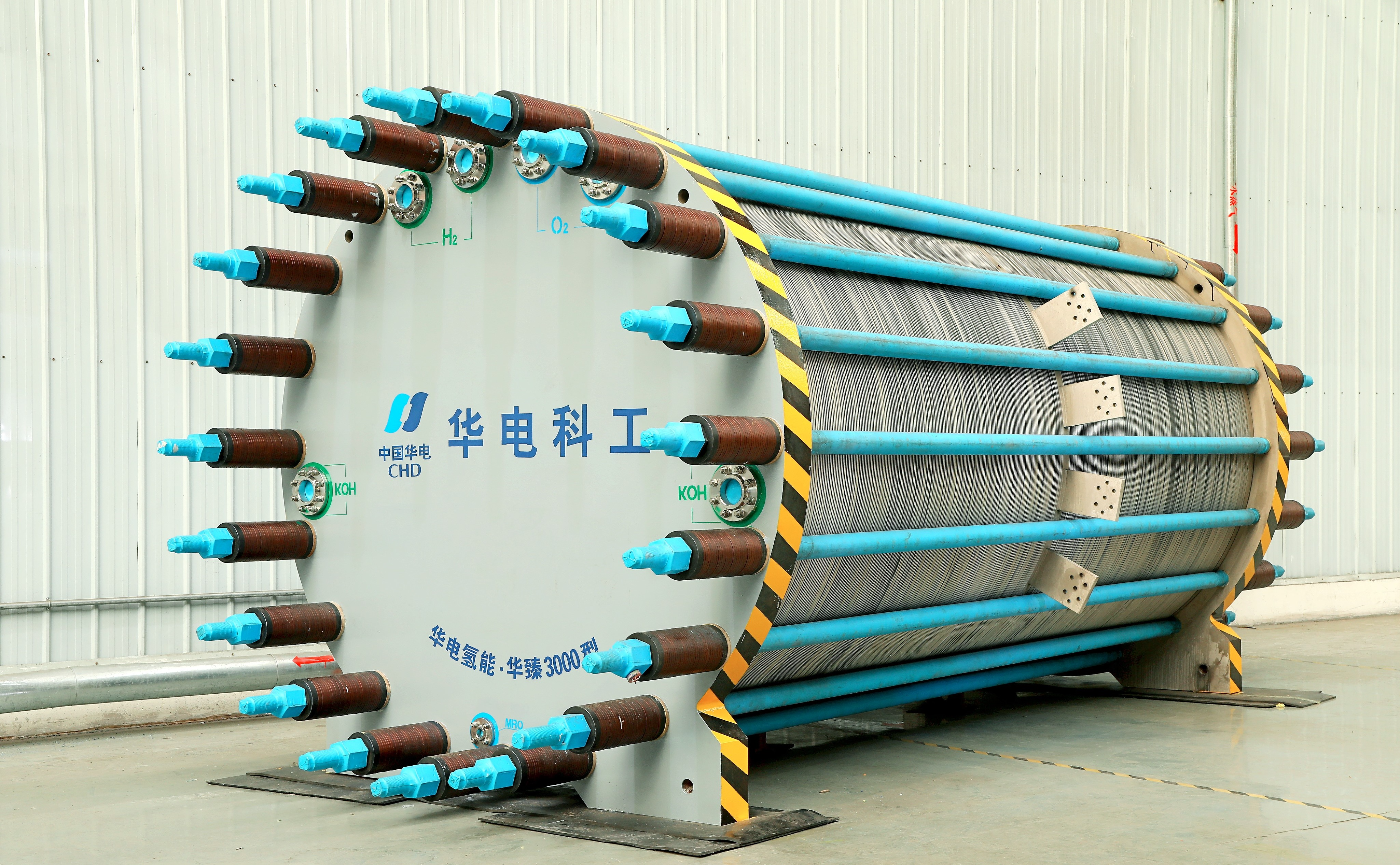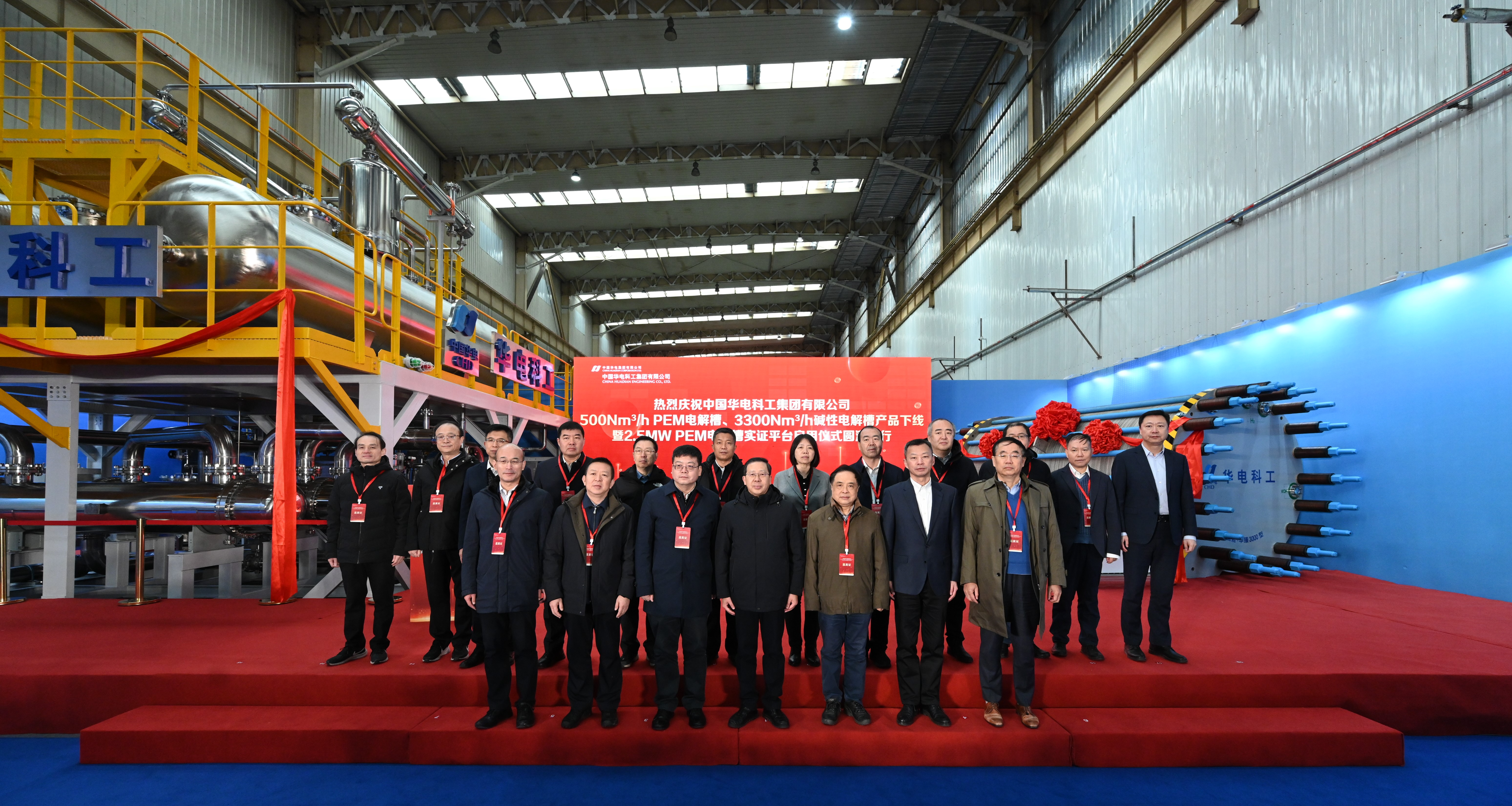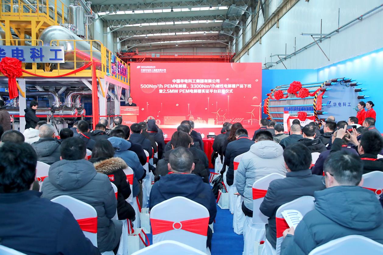 2025年1月3日,中国华电所属中国华电科工集团有限公司(以下简称“华电科工”)500Nm3/hPEM电解槽、3300Nm3/h碱性电解槽产品下线暨2.5MWPEM电解槽实证平台启用仪式在天津北辰区华电(天津)高端智造科创基地顺利举行。标志着我国可再生能源电解水制氢装备实现新突破,对加快构建新型能源体系、促进“双碳”目标实现具有重要意义。