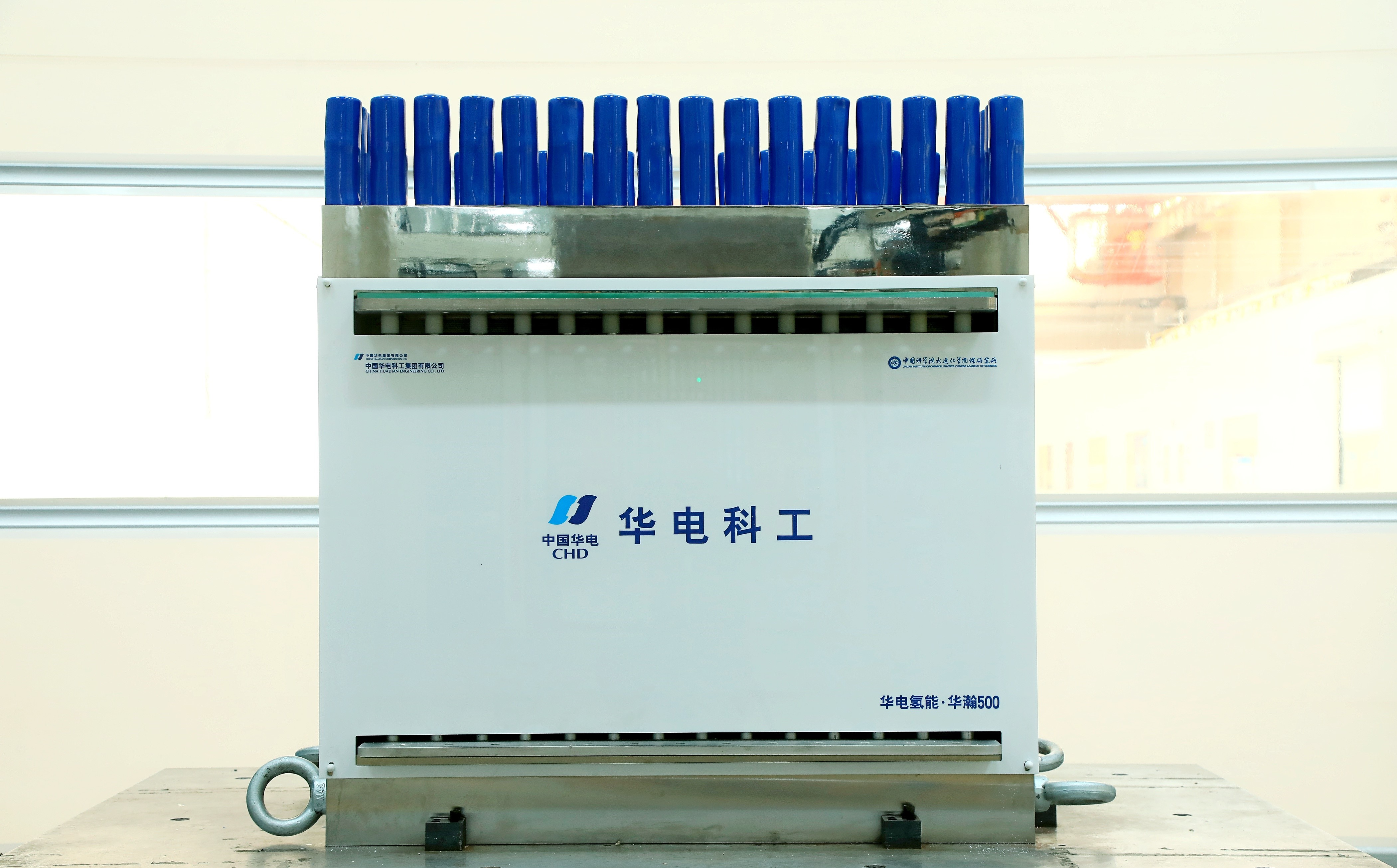 本次下线的“华瀚”500Nm3/hPEM电解槽由华电科工与中国科学院大连化学物理研究所联合研发,具有电流密度高、直流能耗低、负荷调节范围宽、使用寿命长等特点。产品膜电极总贵金属载量较传统电解槽降低30%;电流密度可达3A/cm2;单槽产氢量≥500Nm3/h;输入功率范围3%-135%;负荷波动响应速率≥20%/s;单片膜电极有效反应面积≥3000cm2,为全球最大,突破了我国质子交换膜电解槽大型化发展核心技术瓶颈,产品整体性能达到国际先进水平。