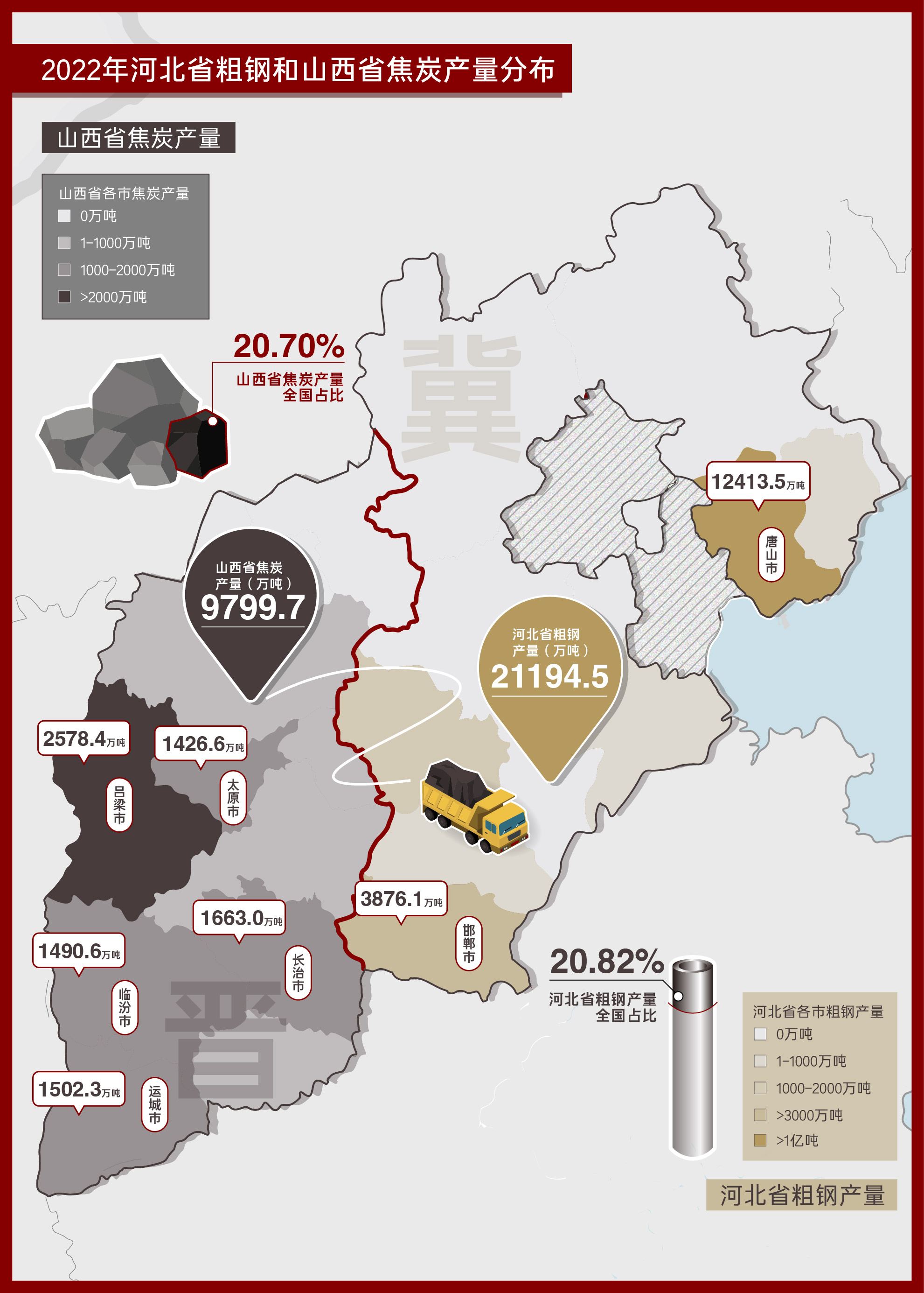 2022年河北省粗钢和山西焦炭产量分布