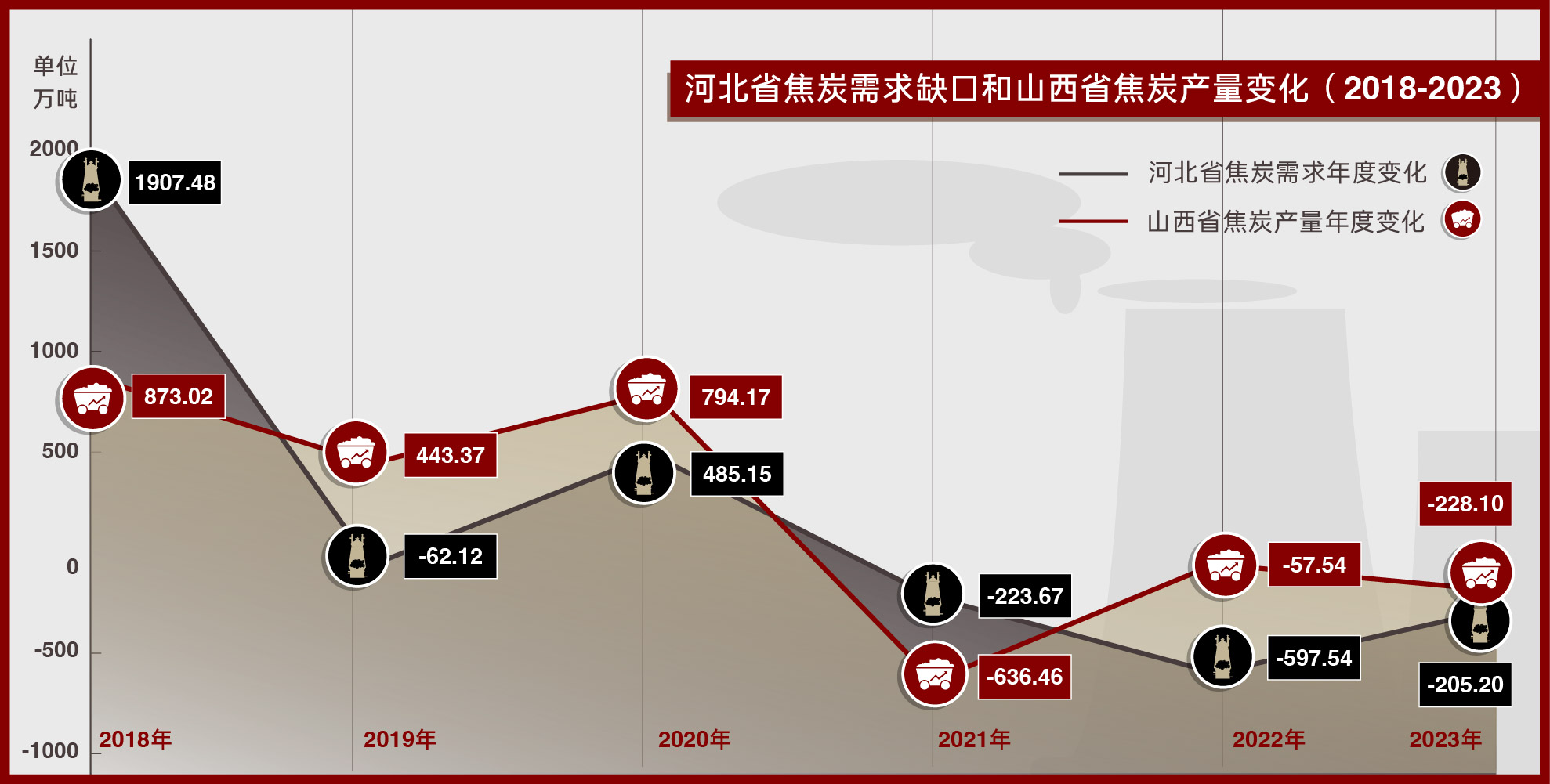河北省焦炭需求缺口和山西省焦炭产量变化 (2018-2023)