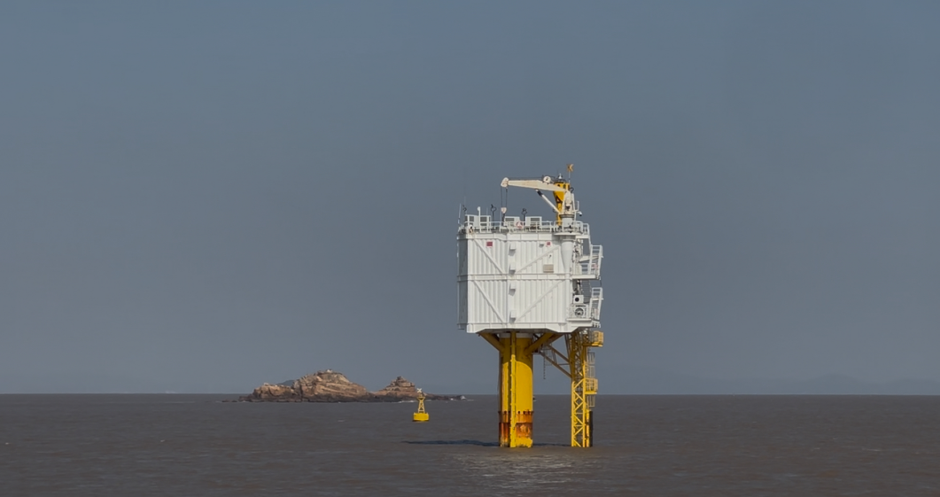 在浙江舟山,普陀山岛与葫芦岛之间的海域上,一个带着旋转叶片、黄白相间的桩柱式潮流能发电设备巍然屹立。