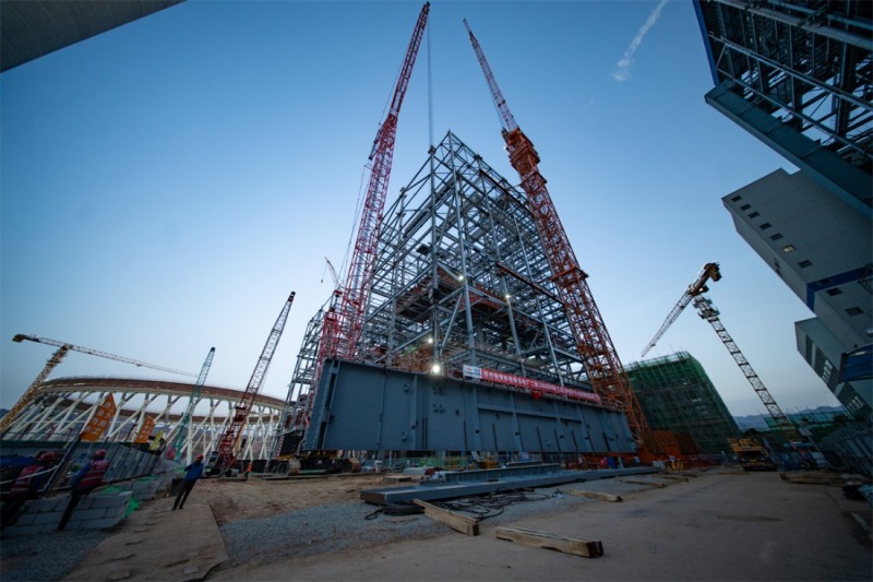 本次吊装的大板梁作为锅炉钢结构的“脊梁”,共5根,最重MB-4上梁长35.1米,高4.2米,宽1.4米,重达104.7吨。大板梁吊装是二期工程锅炉钢架吊装的关键环节,面对构件体积大、重量重、吊装高度高等复杂挑战,二期项目部提前进行专项策划,多次组织专业技术人员反复论证安全措施及技术方案,并邀请电力行业协会5名资深起重专家对方案的合理性、安全性进行专业评审,为大板梁吊装提供充分的安全技术保障。吊装前,二期项目部组织各参建单位对大板梁吊耳焊缝、挠度值及外观尺寸进行严格检查验收,确保“一次吊装成功”。