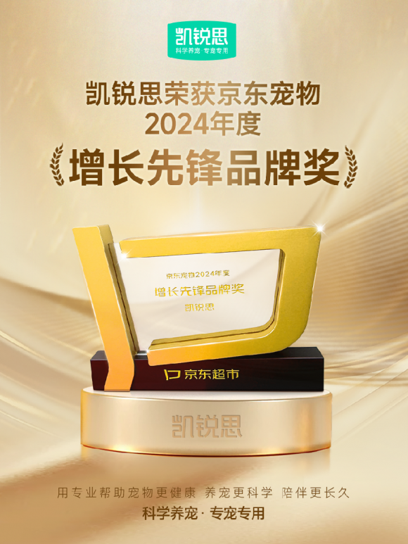 在宠物行业数字化转型的浪潮中,凯锐思与京东宠物的合作轨迹,折射出新消费时代品牌与平台从流量交易走向价值共生的深刻变革。这一进程的起点可追溯至2021年“品质卓越店铺奖”的获得——彼时的凯锐思率先在京东平台开启“不吃包退服务”,并于2022年被授予“最佳合作伙伴奖”,此时,凯锐思已不再仅是平台上的销售方,而是转化为平台深度合作的共创者。当时间推进至2024年“增长王牌”加冕时刻,此后2025年3月27日凯锐思斩获“增长先锋品牌奖”,标志着双方进入生态级战略协同新阶段。