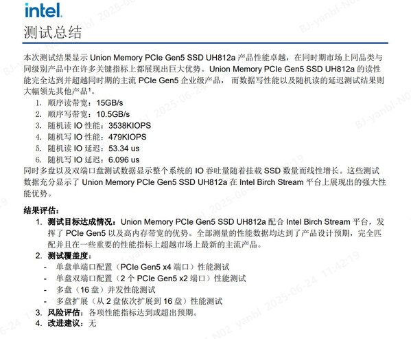 测试结果表明,UH812a产品性能卓越,全面达成且超出设计目标。其在关键性能指标上显著领先于同代际主流竞品,充分释放了PCIeGen5高速总线和平台内存带宽的性能潜力。