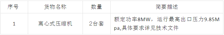 本次拟采购2台套压缩机组,包括压缩机及辅助系统、压缩机组控制系统、驱动电机、变频器、外部冷却系统及技术服务的采购。