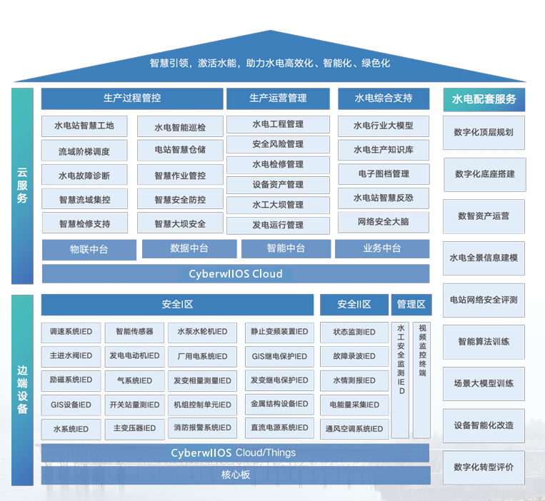 为响应新型电力系统建设需求,中能拾贝以国产化自主可控的拾贝云工业智能操作系统CyberwIIOS为核心底座,构建水电“区域-厂站”双级架构下的全链路解决方案,覆盖“智慧感知—数智平台—业务应用—管理协同—决策优化”五大维度,依托能效优化与电力智能调控双引擎,推动水电厂向“自主预判-智能决策-动态演进”的高阶形态进化。