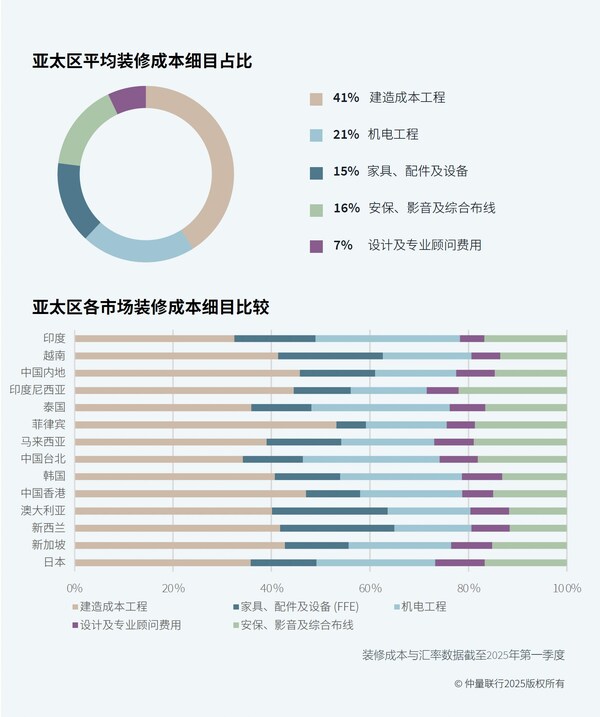 《指南》显示,过去12个月亚太区大部分市场的装修成本持续上涨,截至2025年第一季度,64%的亚太区市场出现材料成本上升,43%的市场面临劳动力短缺的情况。