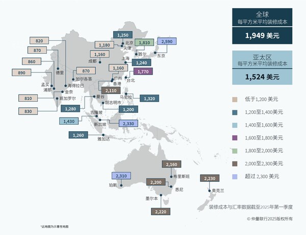 仲量联行近日发布《2025亚太区办公室装修成本指南》(以下简称《指南》),统计覆盖亚太区14个市场、27个城市的平均办公装修成本数据(以美元计价)。截至2025年第一季度,亚太区平均装修成本为每平方米1,524美元,整体保持上涨趋势。其中,东京以每平方米2,590美元蝉联"亚太区最贵城市",北京以每平方米1,250美元继续领跑中国内地。